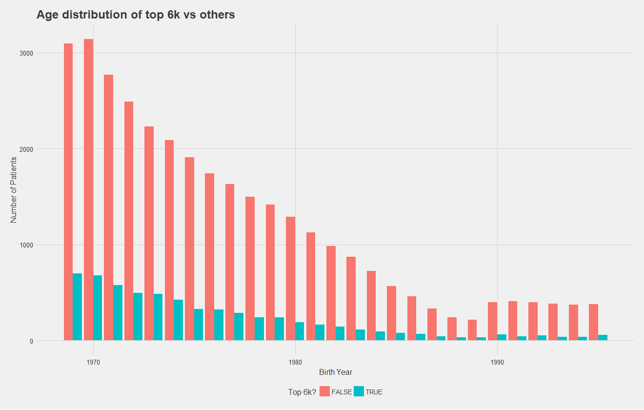 Below, I show the age distribution of the top 6,000 high cost and non-high cost patients, which number of patients on the y axis. To improve this graph, I should have normalized by total number of patients to make differences in the distribution more apparent, but it's clear that distributions are relatively similar. While this may suggest age is not a significant predictor, regression models have demonstrated it to be so. Notice that in both graphs however, there is an increase in younger patients.