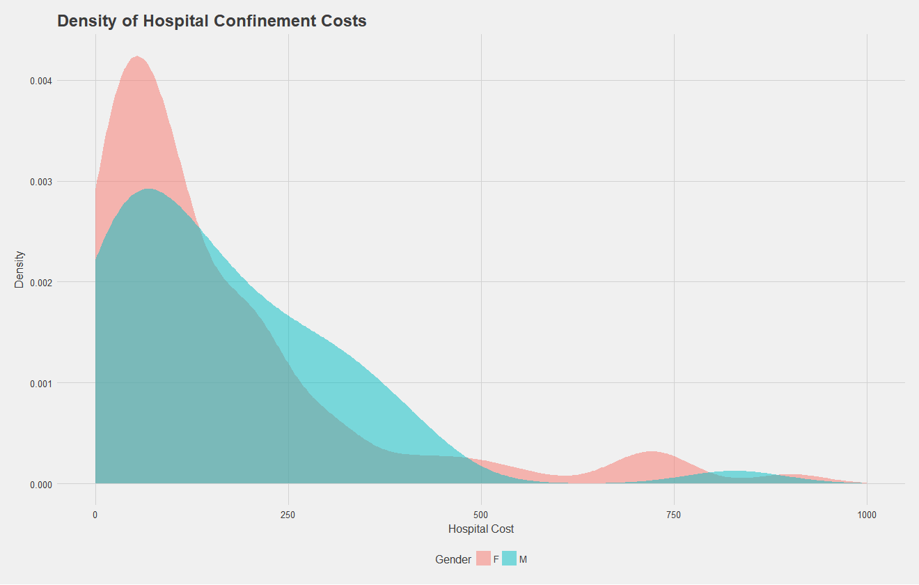 Let's focus in on the density of hospital confinement costs by gender. Below, we see a density plot of each claim, split by sex. Males generally have higher costs, and both males and females see a characteristic bump at the higher end of the spectrum, possibly corresponding to longer stays or surgical procedures.