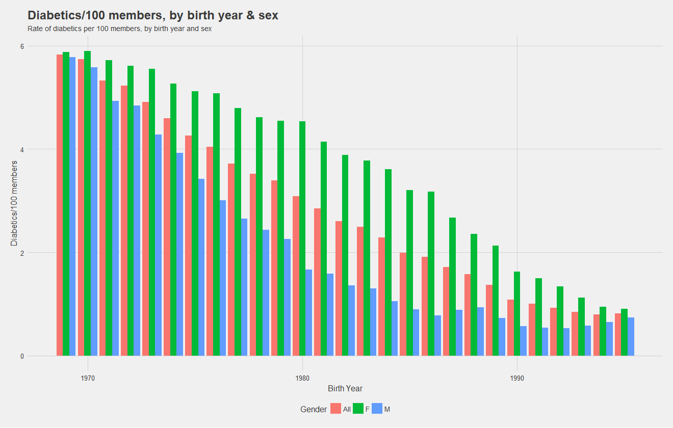 Before building models, it's necessary to understand the data! Below, I show the rate of diabetics, ie number of diabetics per 100 individuals with the insurance by birth year and split by sex. Notice that females have a higher rate overall, and the rate for males drops drastically as age decreases. Notice also, that males see in increase in rate for the youngest cohorts. During the presentation, I was asked if I believe women are at higher risk of diabetes. My response was simply that the data shows a higher rate, there could be confounding variables, but the higher rate is there.