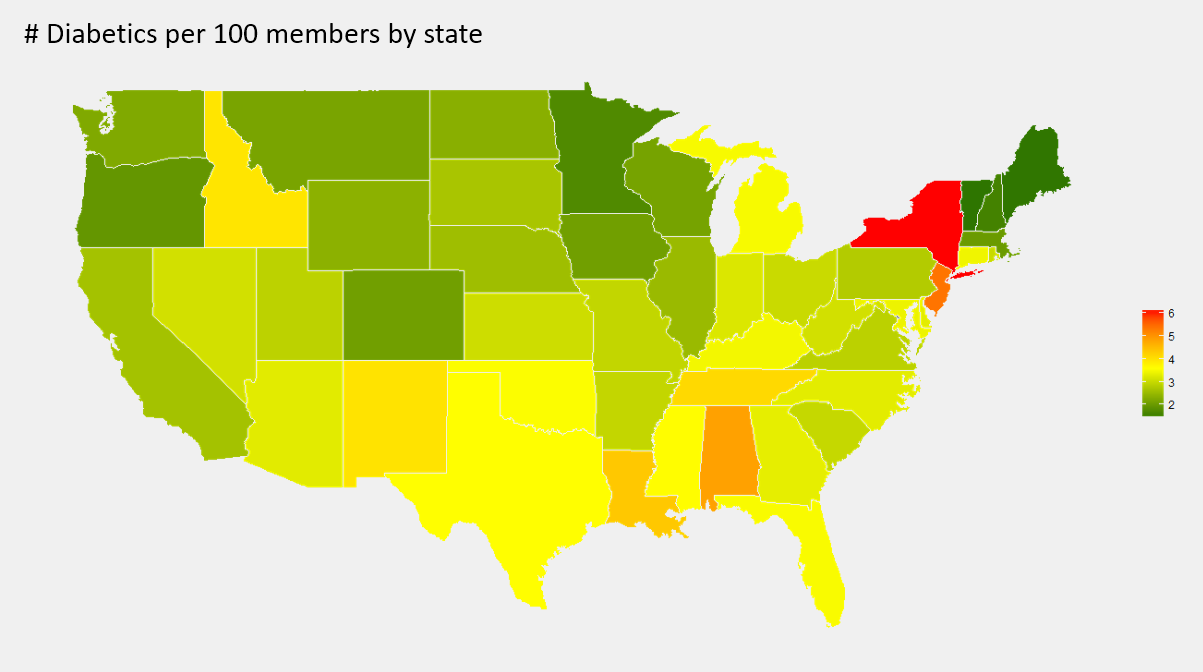 Now, we look at the rate of diabetics per 100 members by state. It appears that the south generally has a higher rate than the north and west, and New York has an especially high rate of diabetics.
