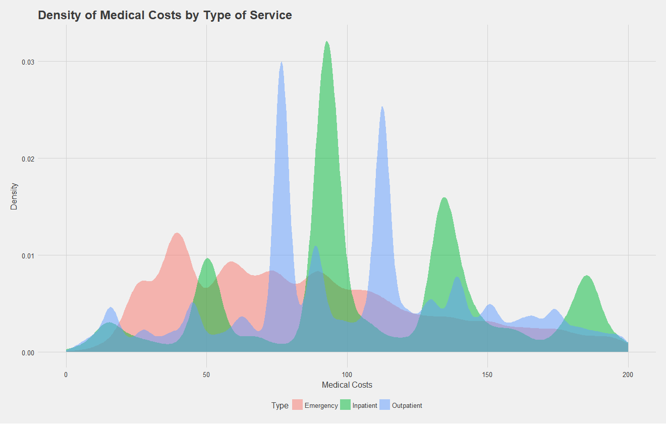 After exploring rates, let us move on to looking at the claims data itself. Note, for all the following analysis, trauma and pregnancy related claims were removed from the data with the help of some regular expressions, as these data are independent of the illness. Below, I show a density plot of outpatient, inpatient, and emergency claims costs for type II diabetics. A high density at a certain point indicates many claims were filed at that price point. Key takeaways from this are that emergency room visits have quite a range of costs, while inpatient and outpatient claims have four and two common costs respectively. These peaks likely correspond to specific procedures that diabetics commonly undergo.