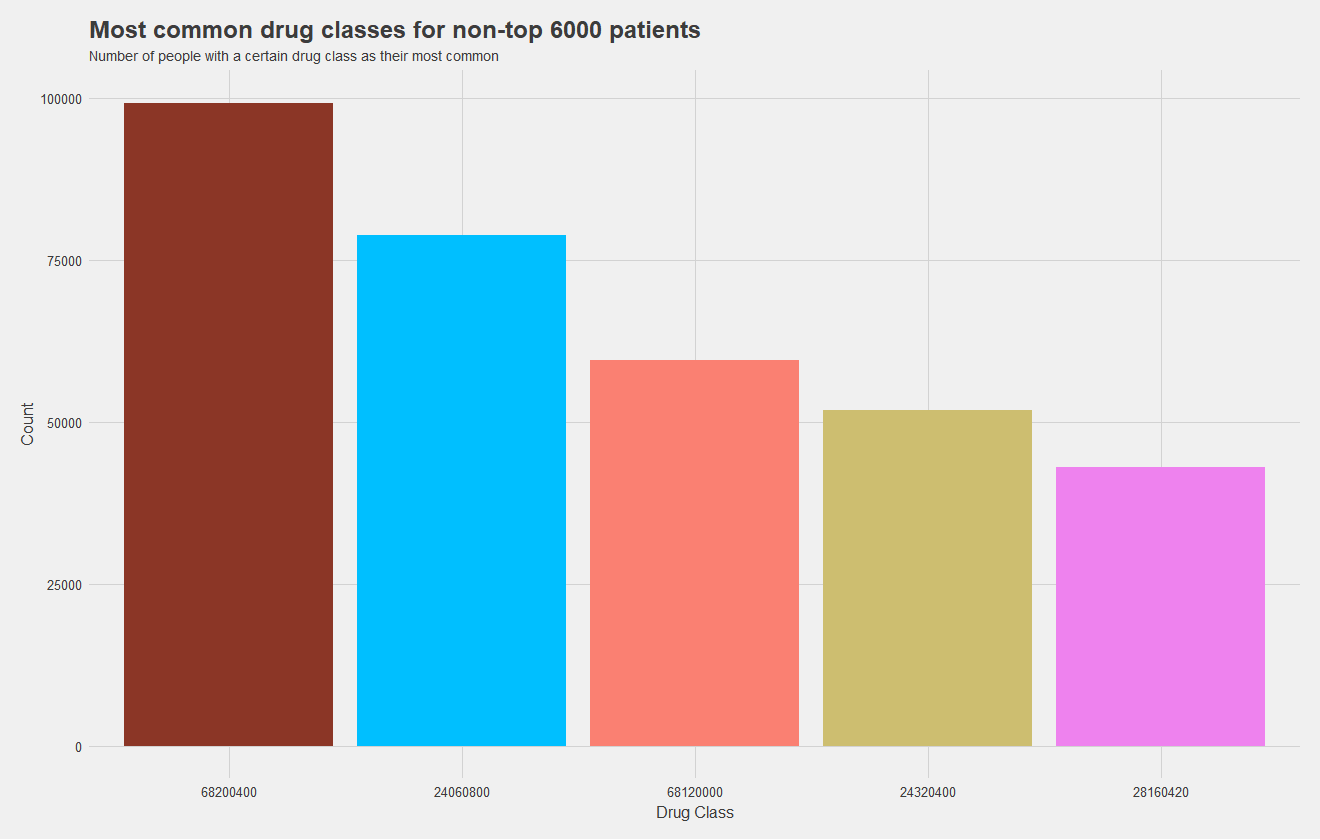The top graph shows the most common drug classes amongst non-high cost patients, and the bottom graph shows most common drug classes amongst high cost patients. Height indicates the number of patients with that drug class as their most common one, and drug classes are color coded, matching between graphs. It's quite apparent that high cost patients use an entirely different set of drugs which makes them high cost. In fact, only two drugs, the maroon and pink, are shared between groups. The green has near double the prevalance as the next most common for the high cost set.
