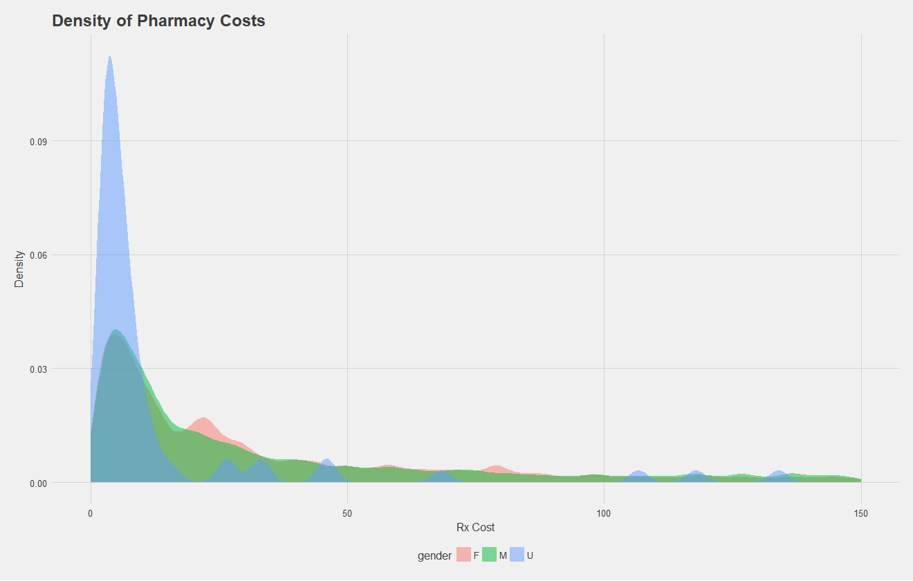 Let's do the same, but for pharmacy costs. Here, some patients had an undefined gender as well. All that's really to take away is there's a similar distribution between sexes.