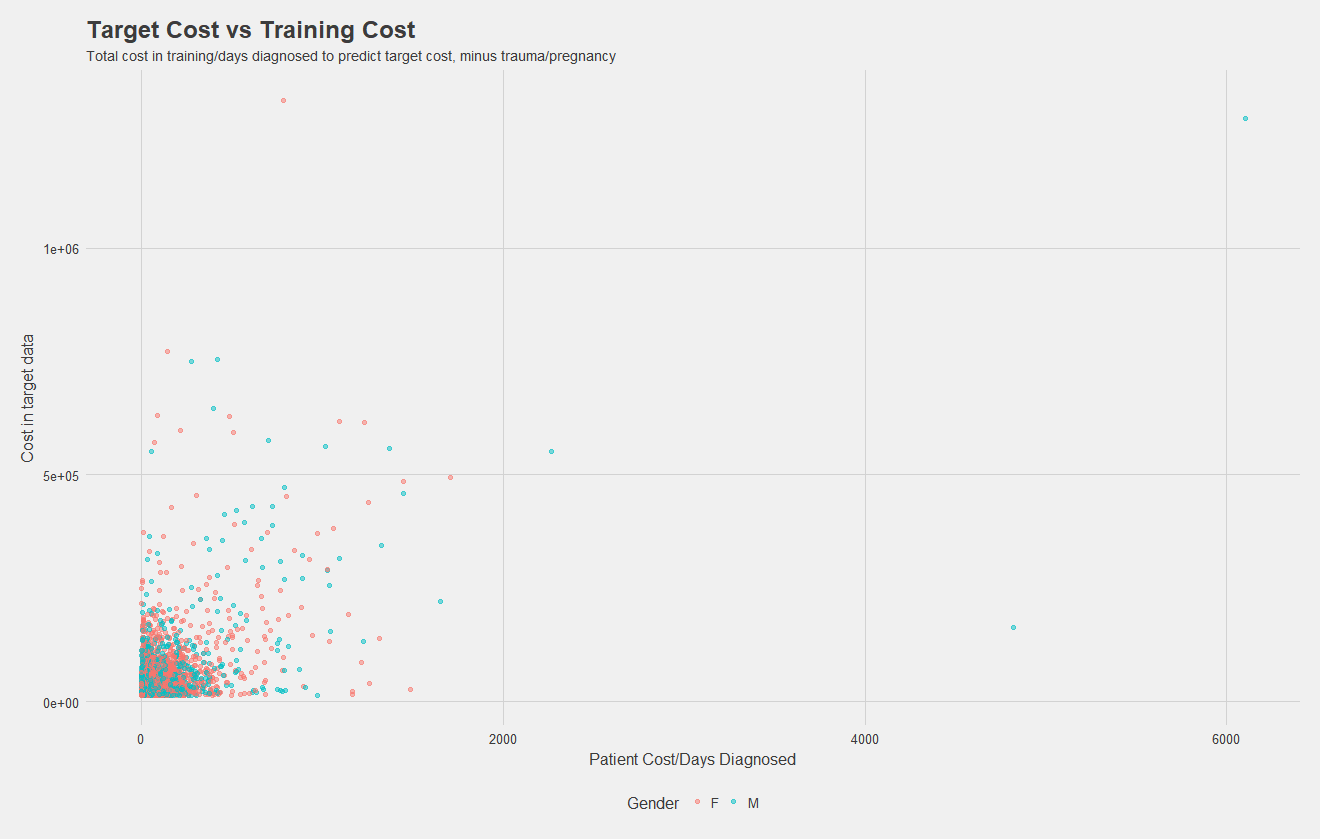Notice, this prediction task is either a classification problem, or a numeric prediction problem depending how you see it. I approached it as numeric prediction, predicting the cost in the next year for each patient and taking the top 6,000. I did approach this with classification techniques, but results were quite poor.