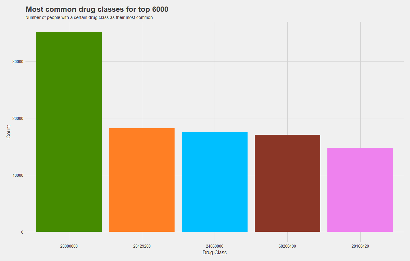 Now, one of my most significant findings, which I sadly did not have time to incorporate into a model, was the high cost dependence on drugs. I attempted to incorporate the most common type of drug a patient uses as a predictor, but there were far too many levels to train the mode effectively and did not serve as a great predictor. What I should have done, is keep the five most common levels and group the rest into "other." This would allow me to train a model more effectively, and as you may notice from the figures below, drug class is pretty significant.