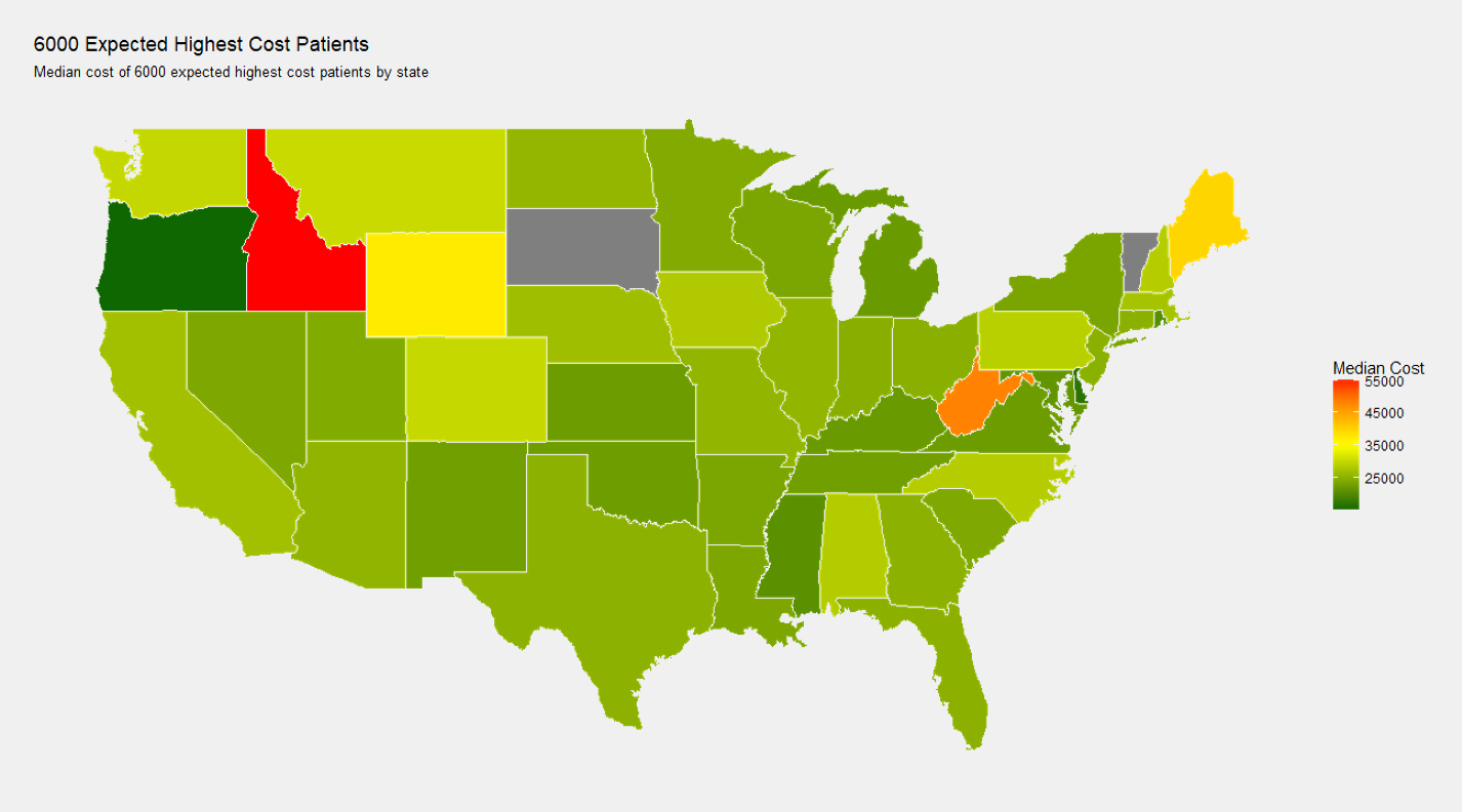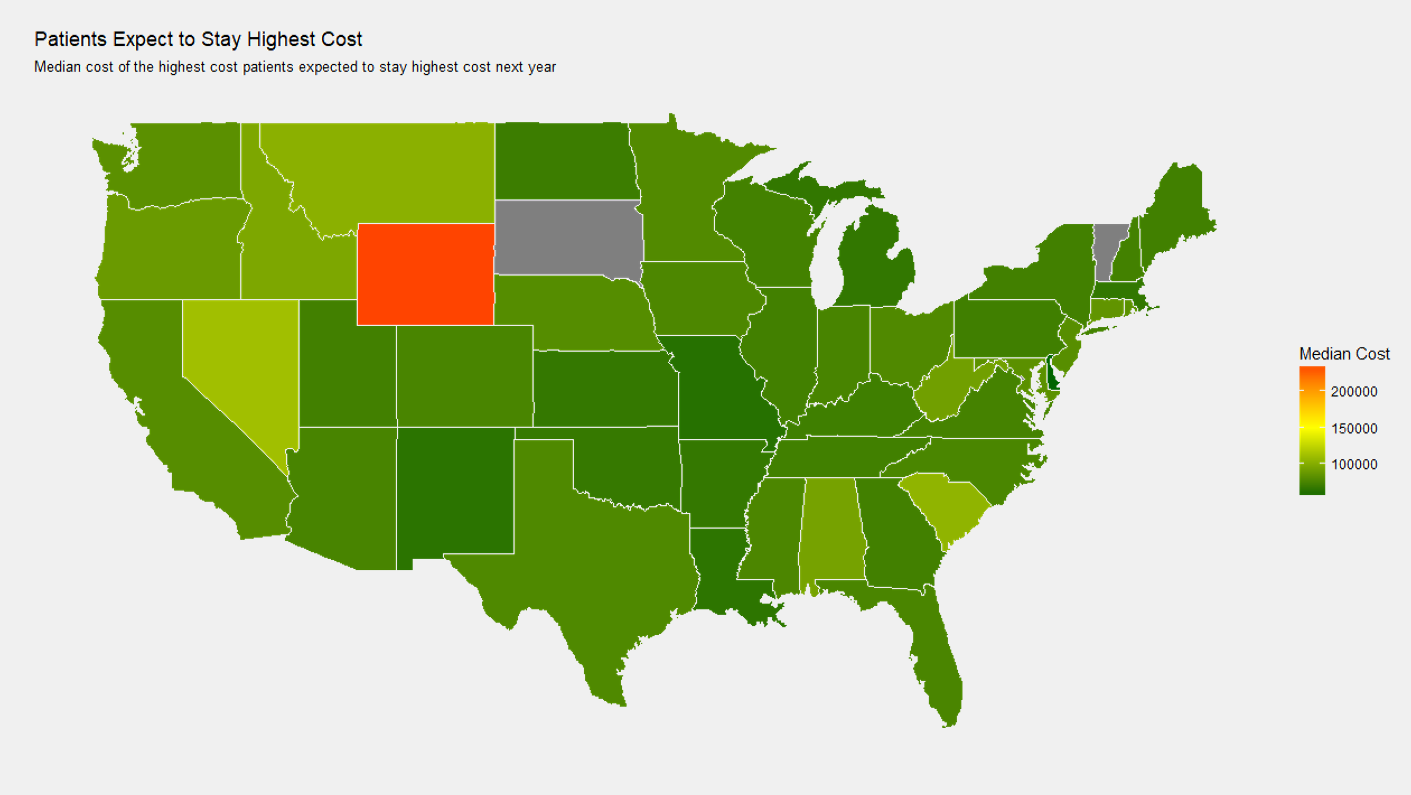 Similar to the above image, I also wanted to see the state dependence of median cost in the 0-36 month dataset of people who will stay high cost.